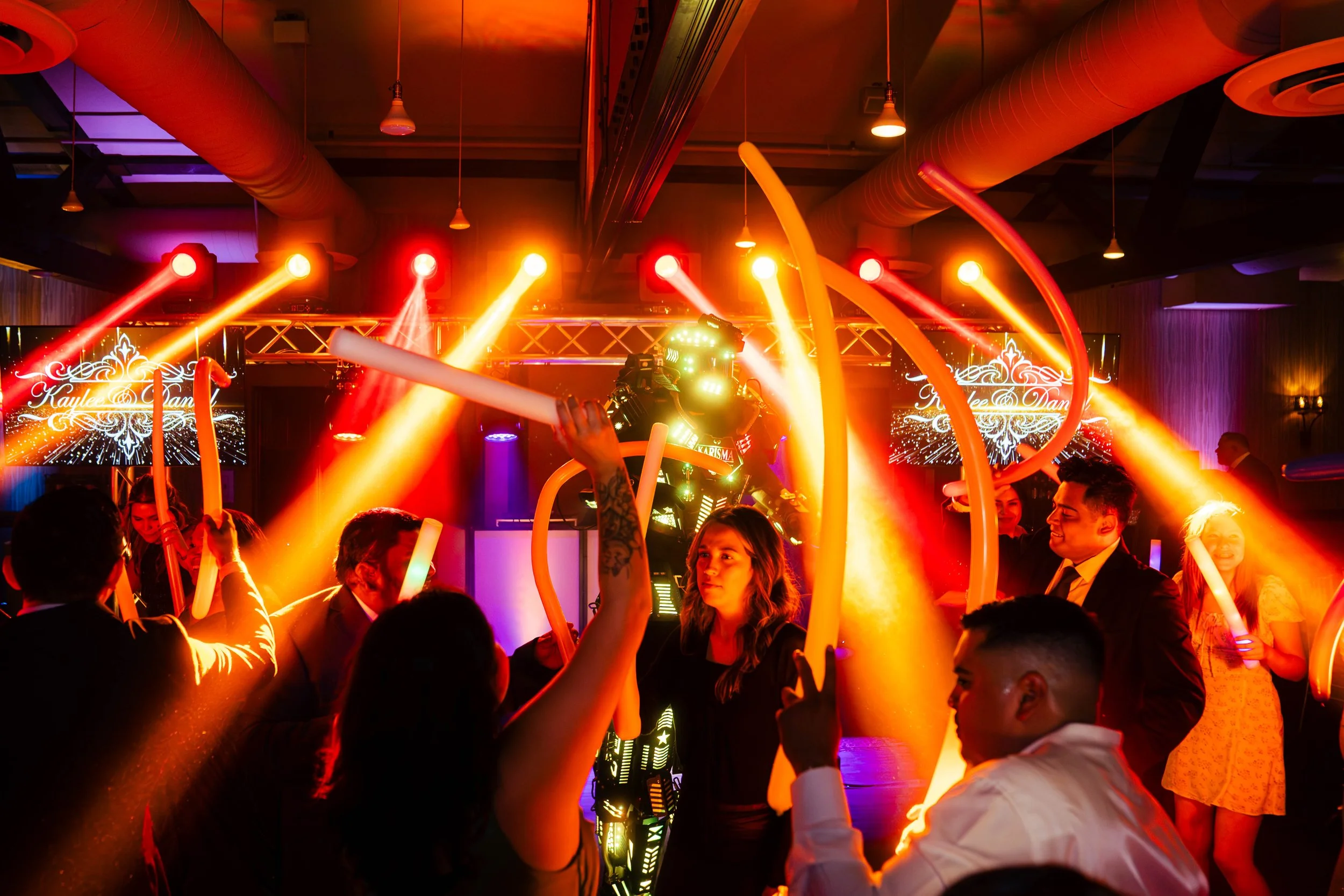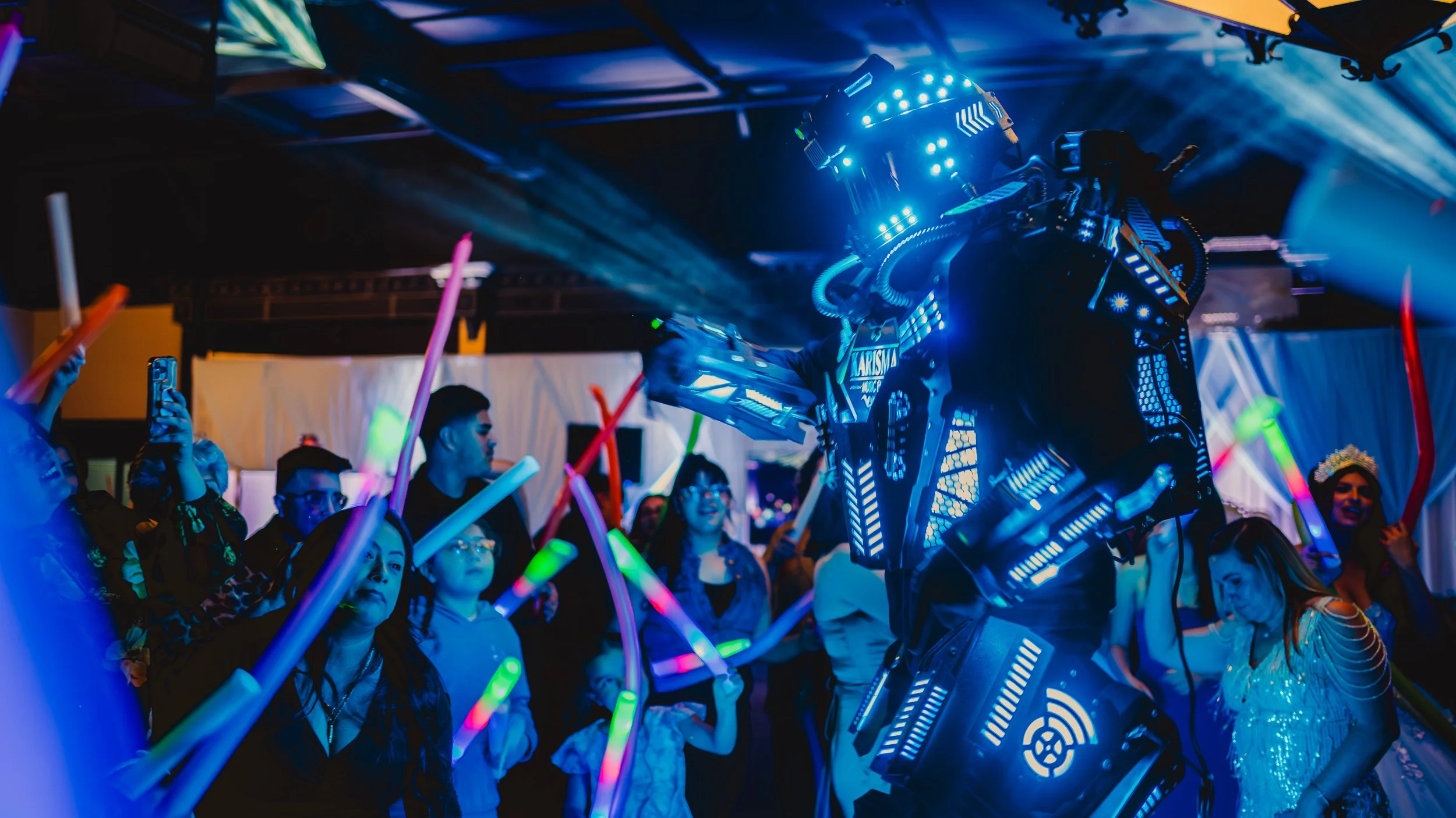 Our Kumbiatron robot is the perfect addition to a youth-filled party. He is equipped with a Co2 gun, LED foam sticks for your guests, and balloons to elevate the dance floor. And yes, Kumbiatron dances to more than just cumbias.